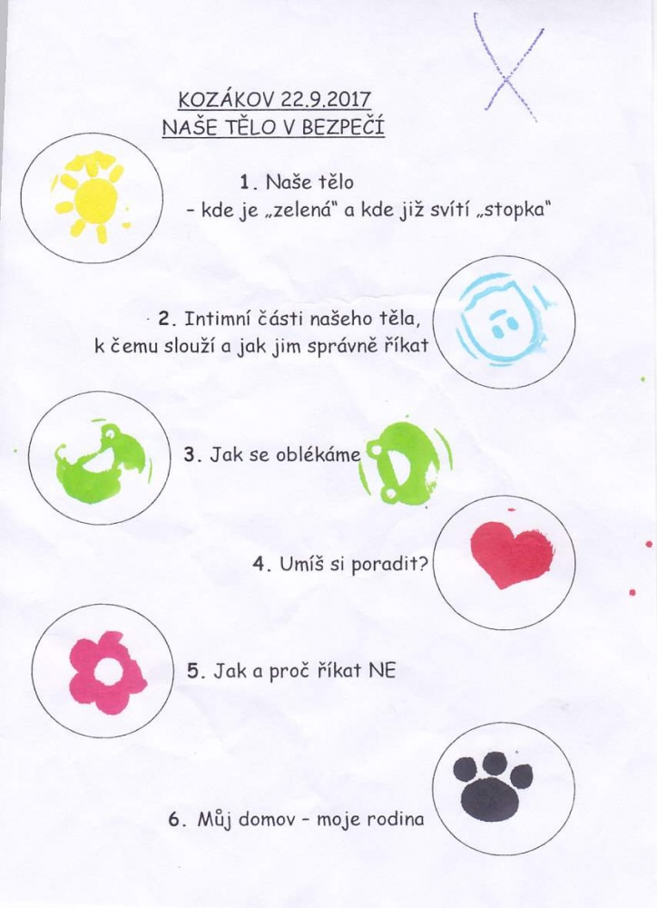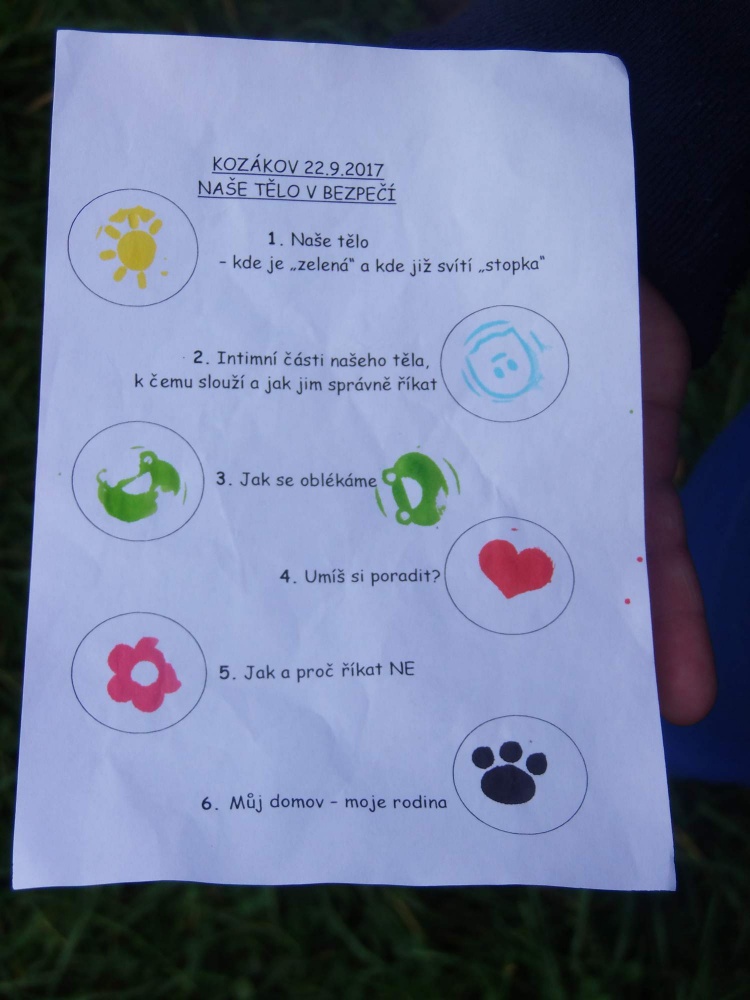 - Naše tělo – kde je „zelená“ a kde již svítí „stopka“ (vymezení částí těla, které neukazujeme ostatním a nikdo se jich nesmí dotýkat)