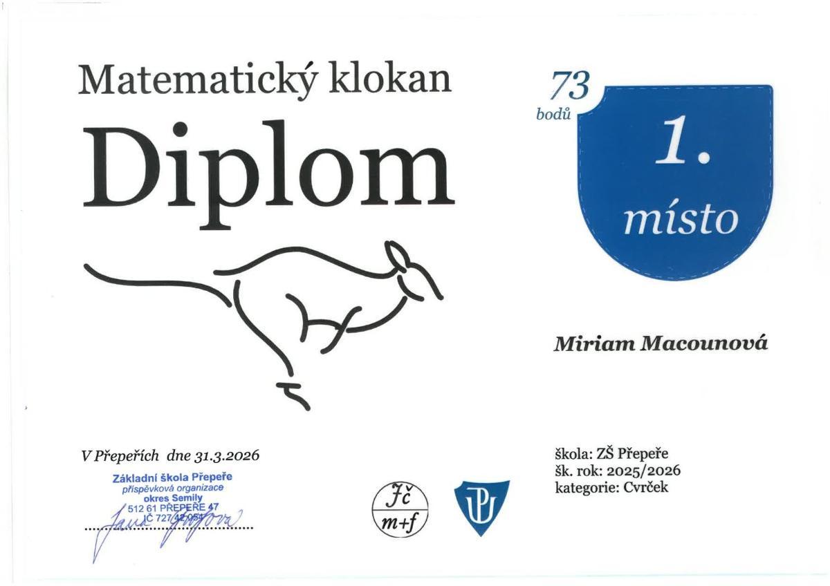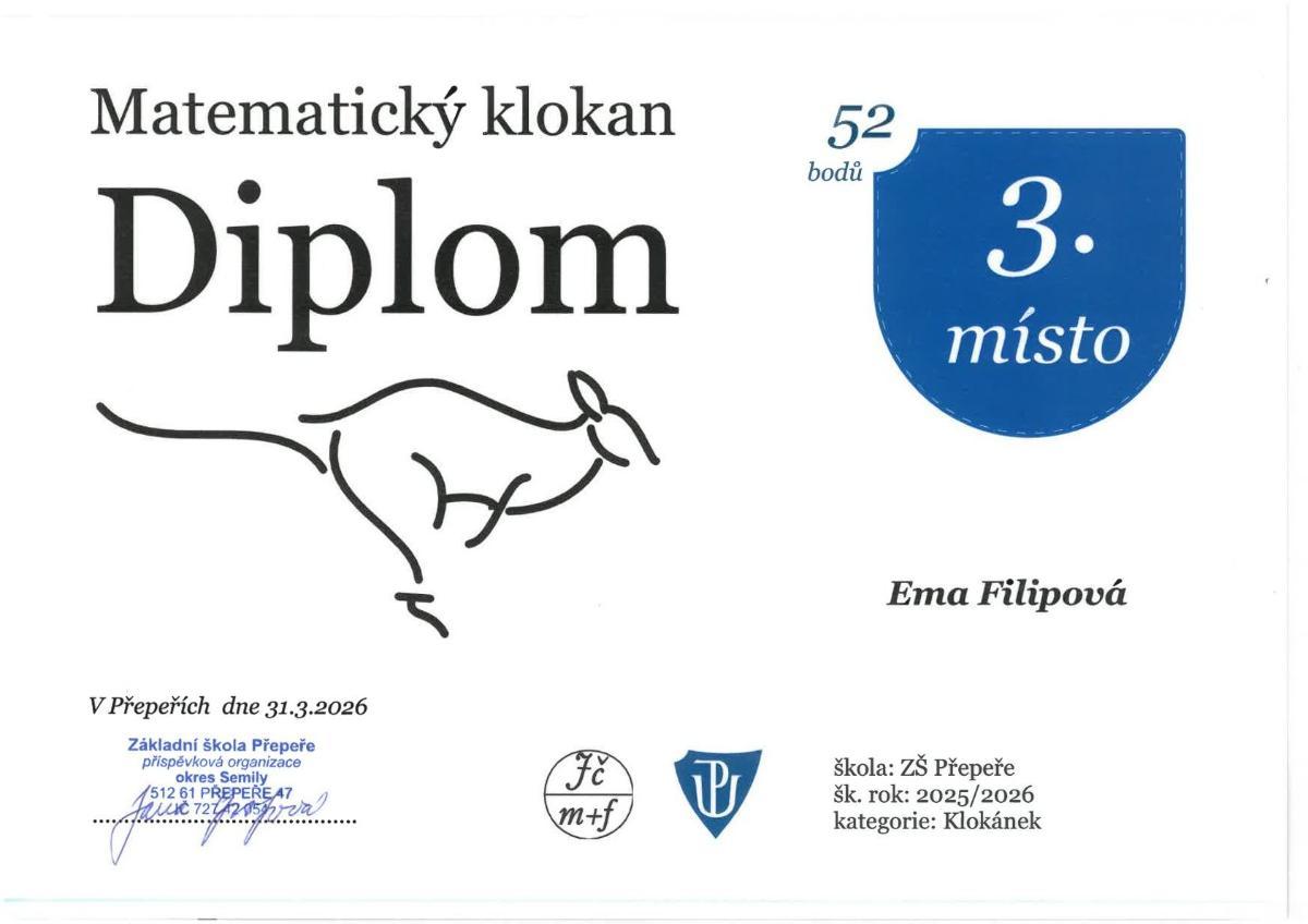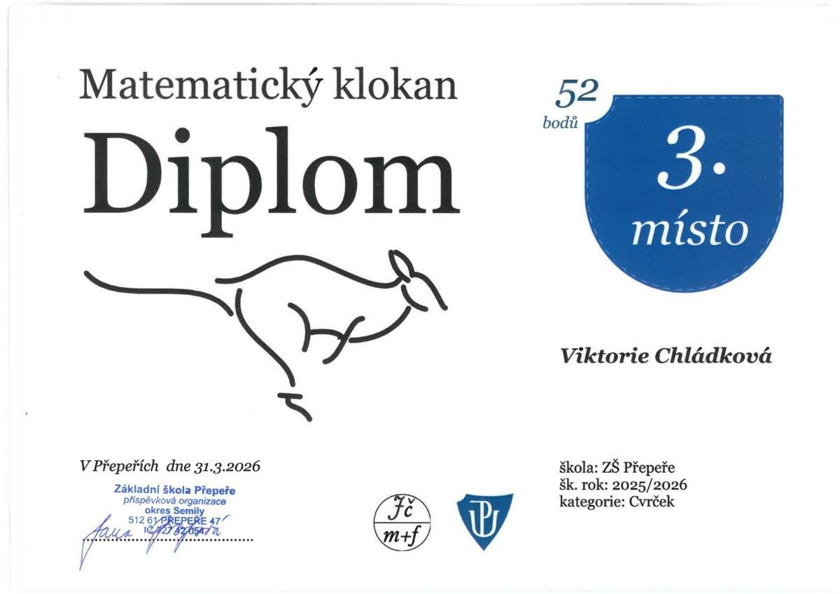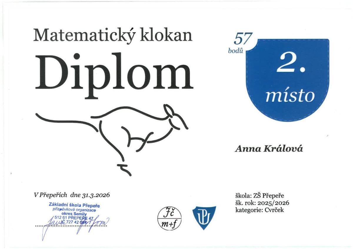 V kategorii Klokánek zvítězil a 1.místo obsadil Danylo Udodenko z 5. třídy. Na 2. místě se umístily Eliška Jakubcová a Ema Náhlovská ze 4. třídy a 3. místo pak patří Emě Filipové z 5. třídy.