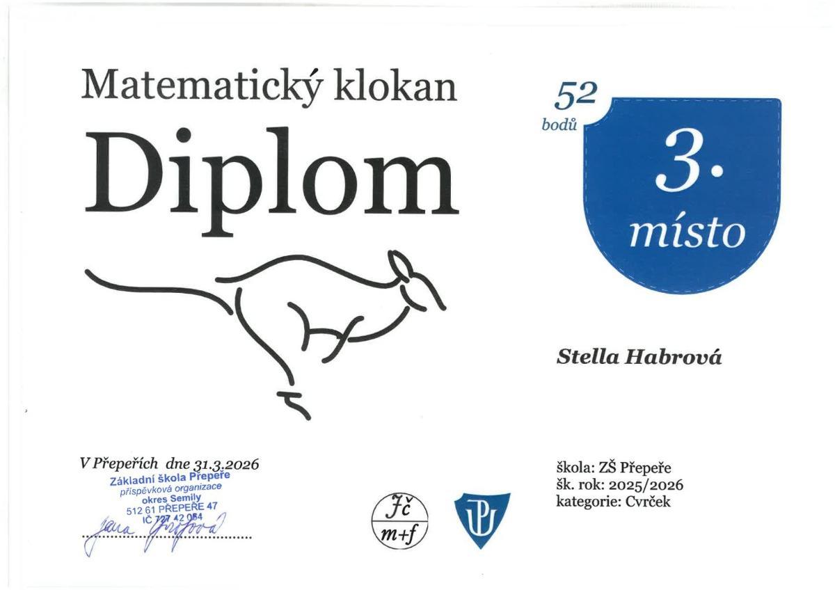 Na naší škole se uskutečnila v pátek 21.3.2026 oblíbená matematická soutěž Matematický klokan, které se zúčastnily děti od druhé do páté třídy. Soutěžící si mohli vyzkoušet své logické myšlení, schopnost řešit netradiční úlohy i rychlost při počítání.