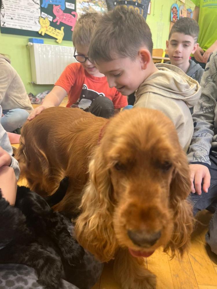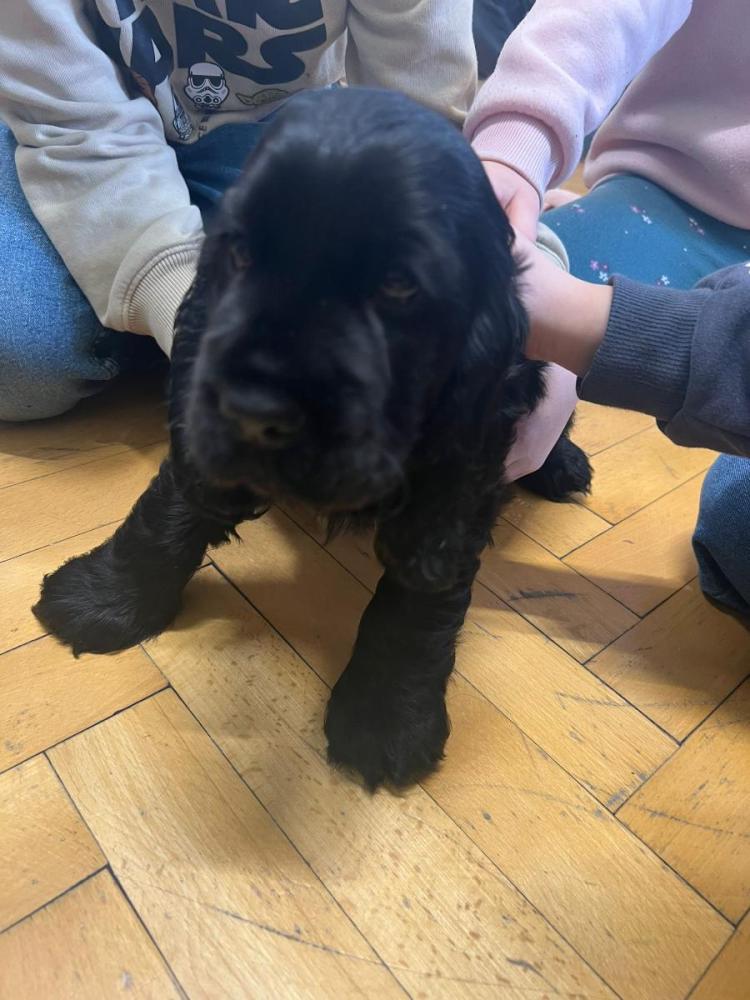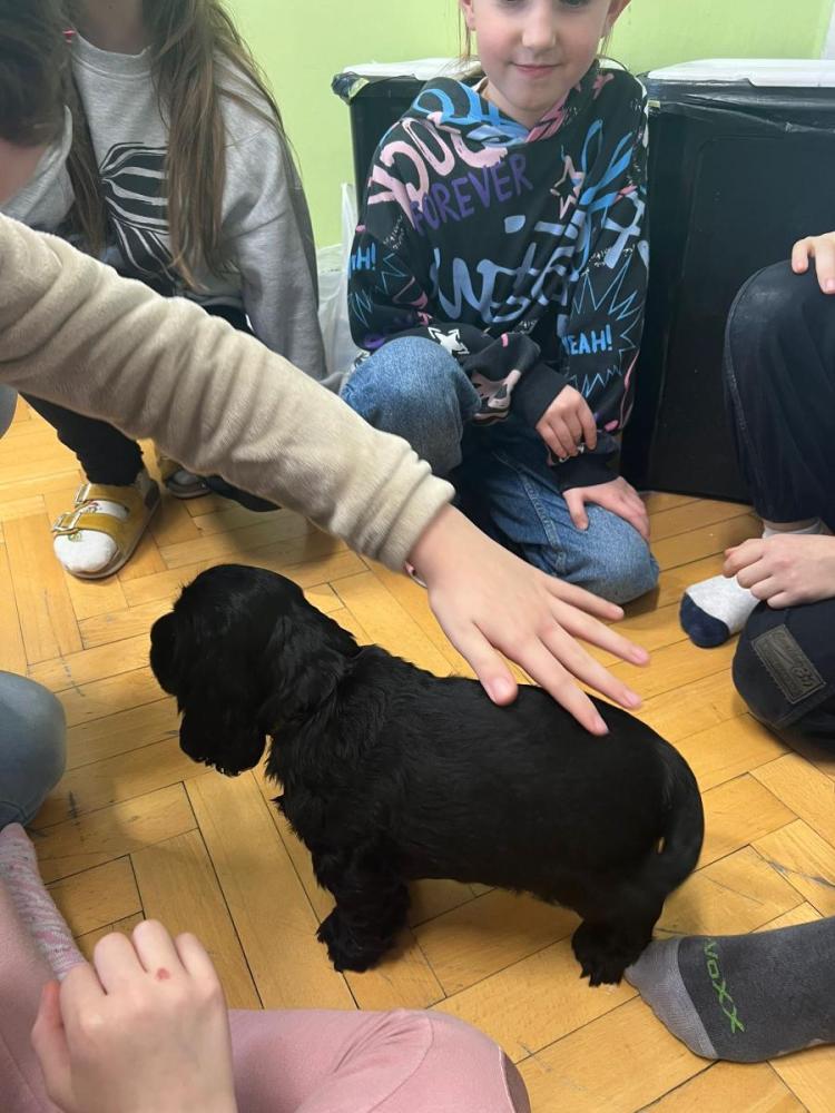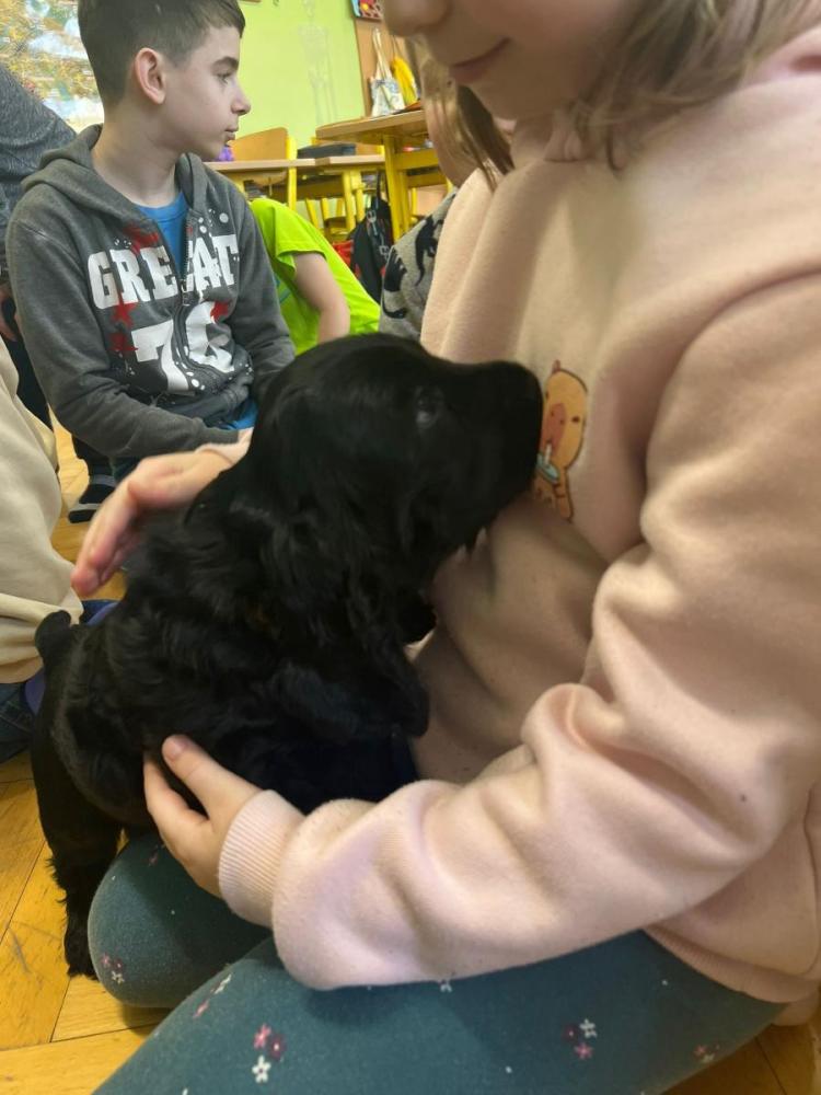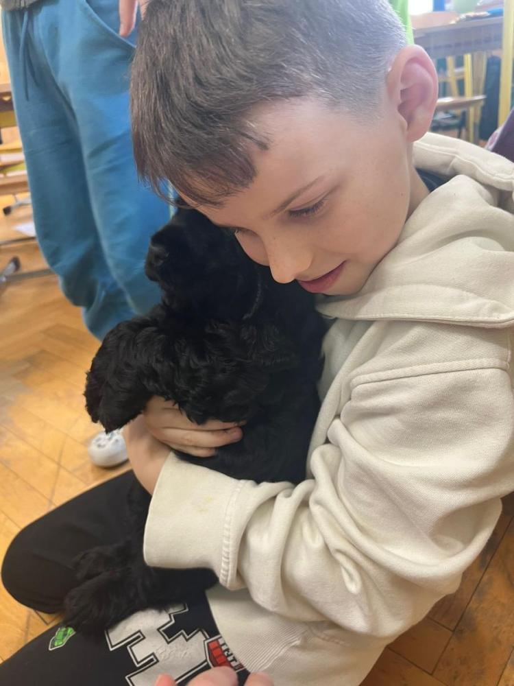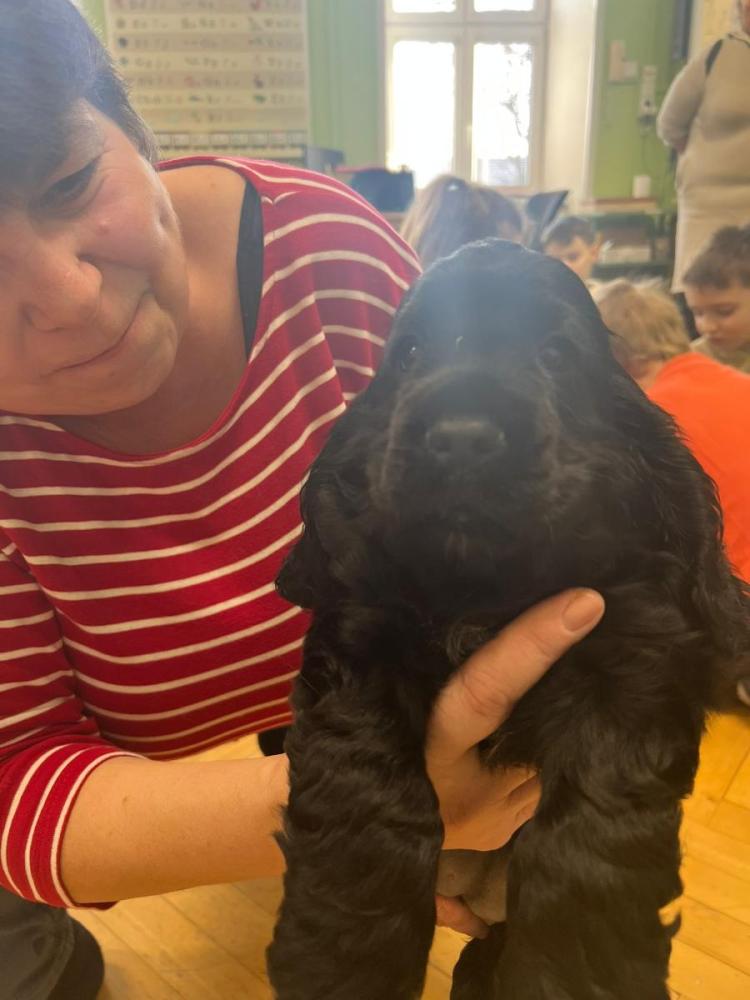 Naší kamarádce fence Claire se před časem narodilo pět štěňátek. Čtyři kluci a jedna holčička, všichni od písmenka A. Přiznám se bez mučení, že si všechna jména členů psí party nepamatuji, jen vím, že slečna je Abigail a dva kluci mají mušketýrská jména Athos a Aramis. Ale snad mi to odpustíte, protože prožitky s psími lumpíky byly pro nás i pro děti velmi silné. Všichni jsme byli nadšeni, když se z přenosné tašky vykulilo pět malých černých válečků. Nejprve ostýchavě očichávali okolí, ale po chvíli už zvědavě prozkoumávali třídu a děti, které poslušně seděly na zemi, aby byly k cvalíkům co nejblíž. Bylo vidět, že štěňátka jsou zvyklá na hlazení, tulení a chování, protože si to od dětí nechala bez problémů líbit. I maminka Claire byla krásně klidná a jenom po očku pozorovala, jak jdou její potomci z náruče do náruče. Takto psíci navštívili postupně všechny třídy a všude si vysloužili velkou pozornost a nadšení. Samozřejmě se občas objevila na zemi i nějaká ta loužička, ale malým nezbedům bylo vše ihned odpuštěno. Program byl pro štěňátka asi dost vysilující, při návštěvě poslední třídy už začala pomalu usínat.