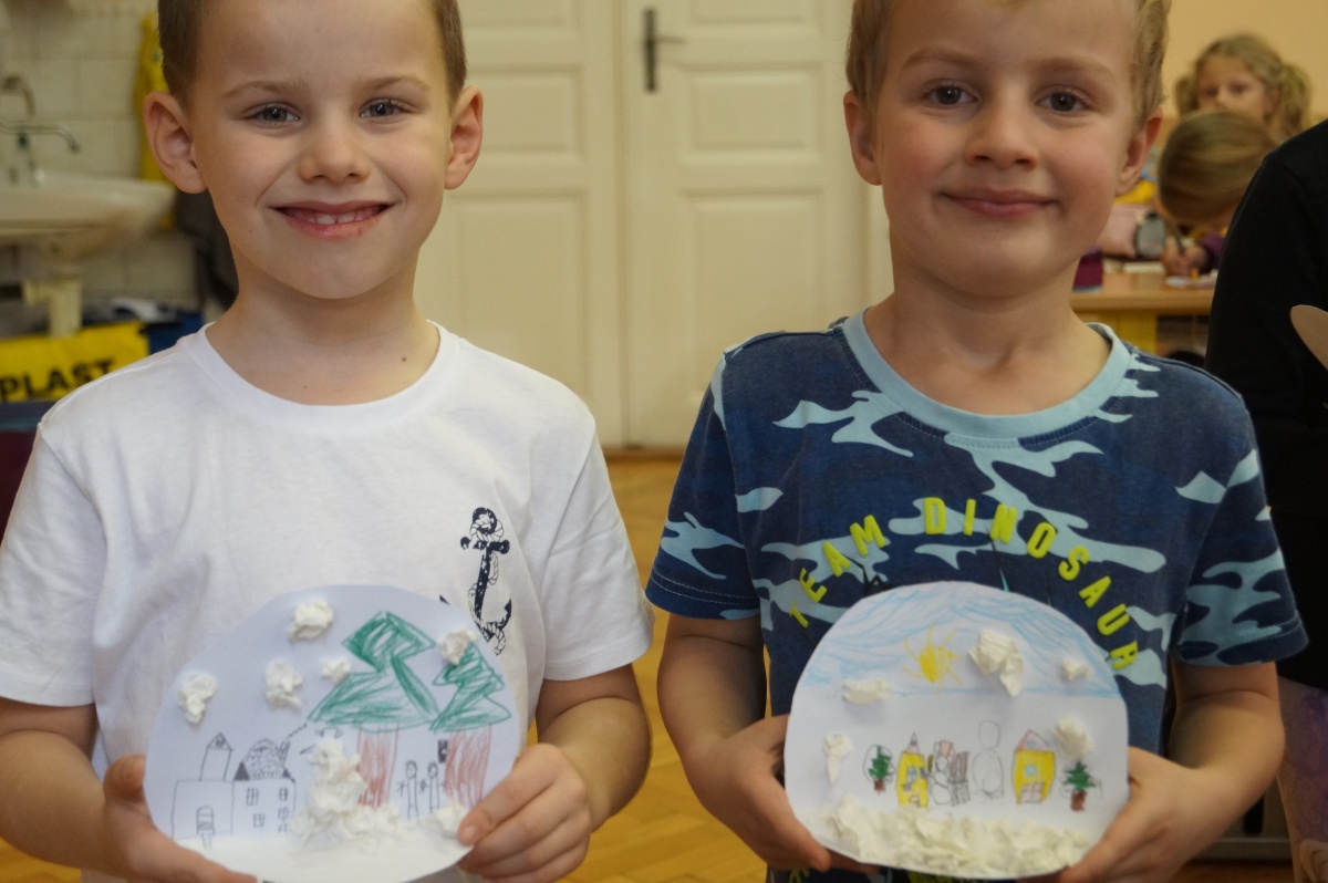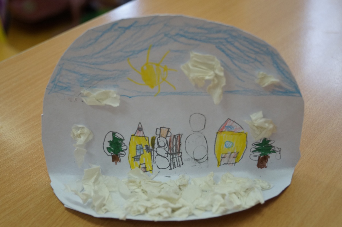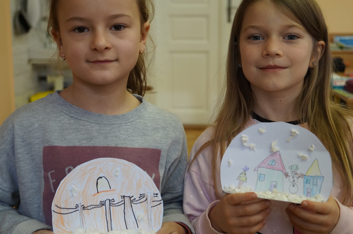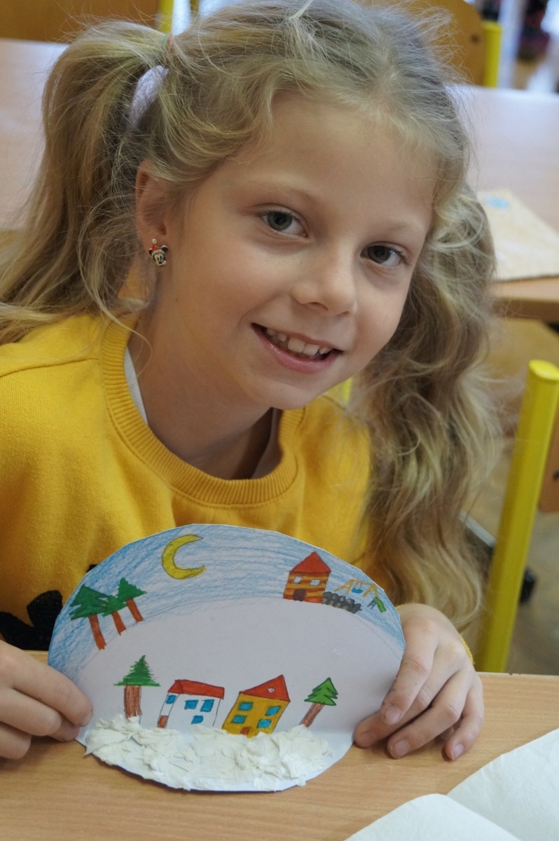 Zimní krajina – lepení barevného papíru, brvení