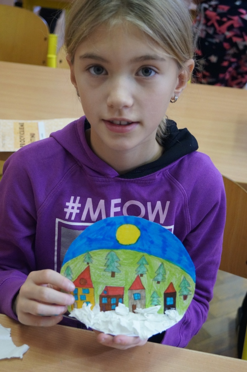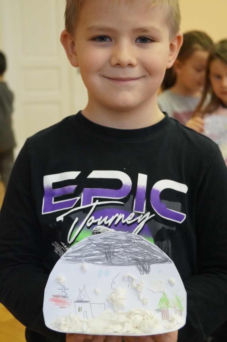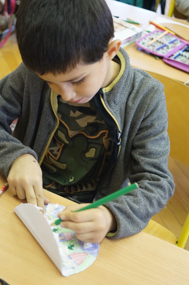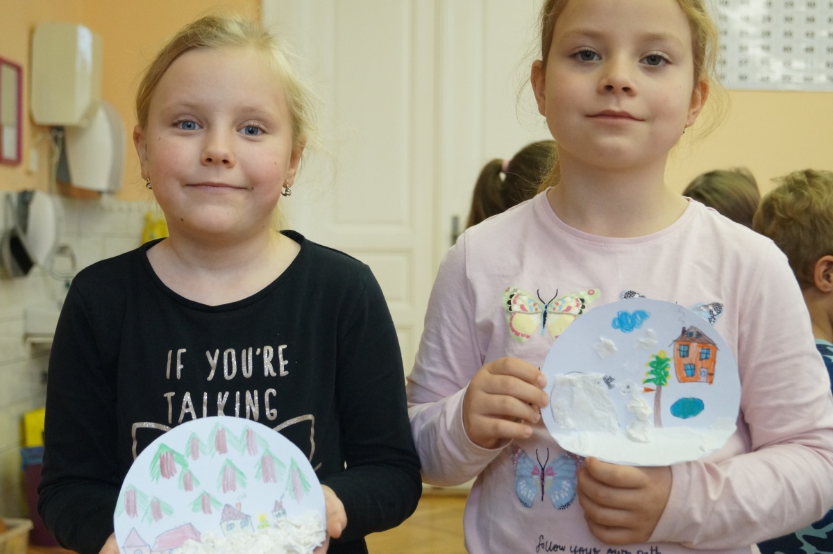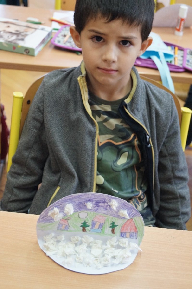 Zimní krajina – lepení barevného papíru, brvení